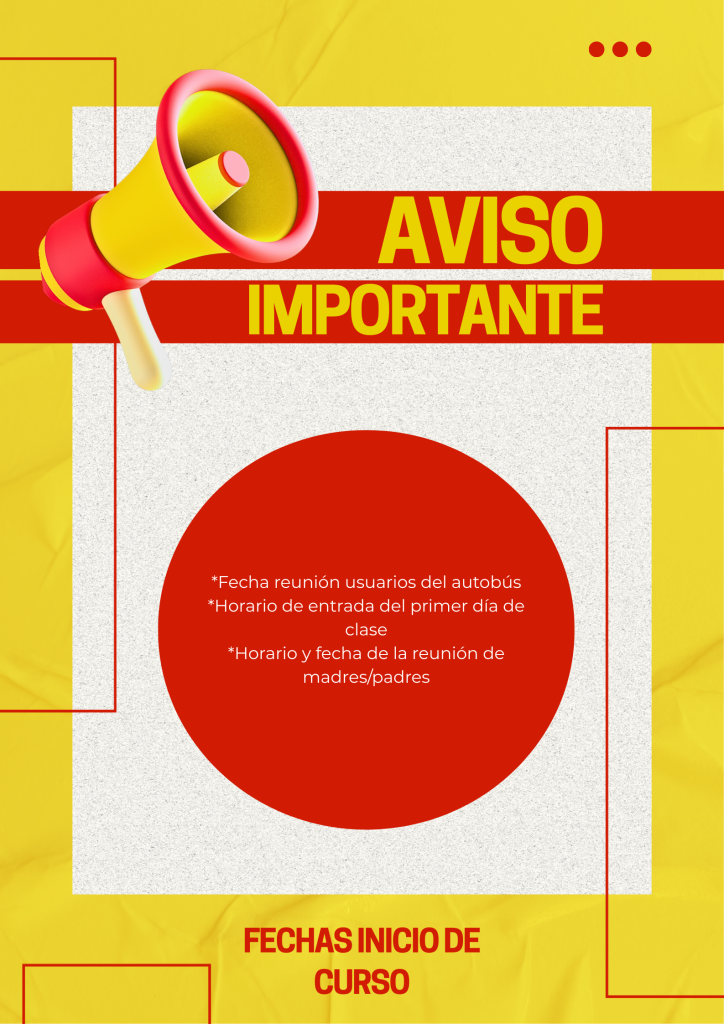 9 DE SEPTIEMBRE A LAS 12:00: REUNIÓN INFORMATIVA DE USUARIOS DEL AUTOBÚS DE VALENCIA DE DON JUAN (se ruega la asistencia) 15 DE SEPTIEMBRE: INICIO DE LAS CLASES, en el siguiente horario: 09:30h PRIMERO DE BACHILLERATO 10:30h SEGUNDO DE BACHILLERATO 12:00h PRIMERO DE GRADO BÁSICO, GRADO MEDIO Y GRADO SUPERIOR 13:00h SEGUNDO DE GRADO BÁSICO, GRADO MEDIO Y GRADO SUPERIOR 22 DE SEPTIEMBRE: REUNIÓN DE MADRES/PADRES, en el siguiente horario: 17:00h CICLOS FORMATIVOS 18:00h BACHILLERATOS 19:00h INMERSIÓN LINGÜISTICA